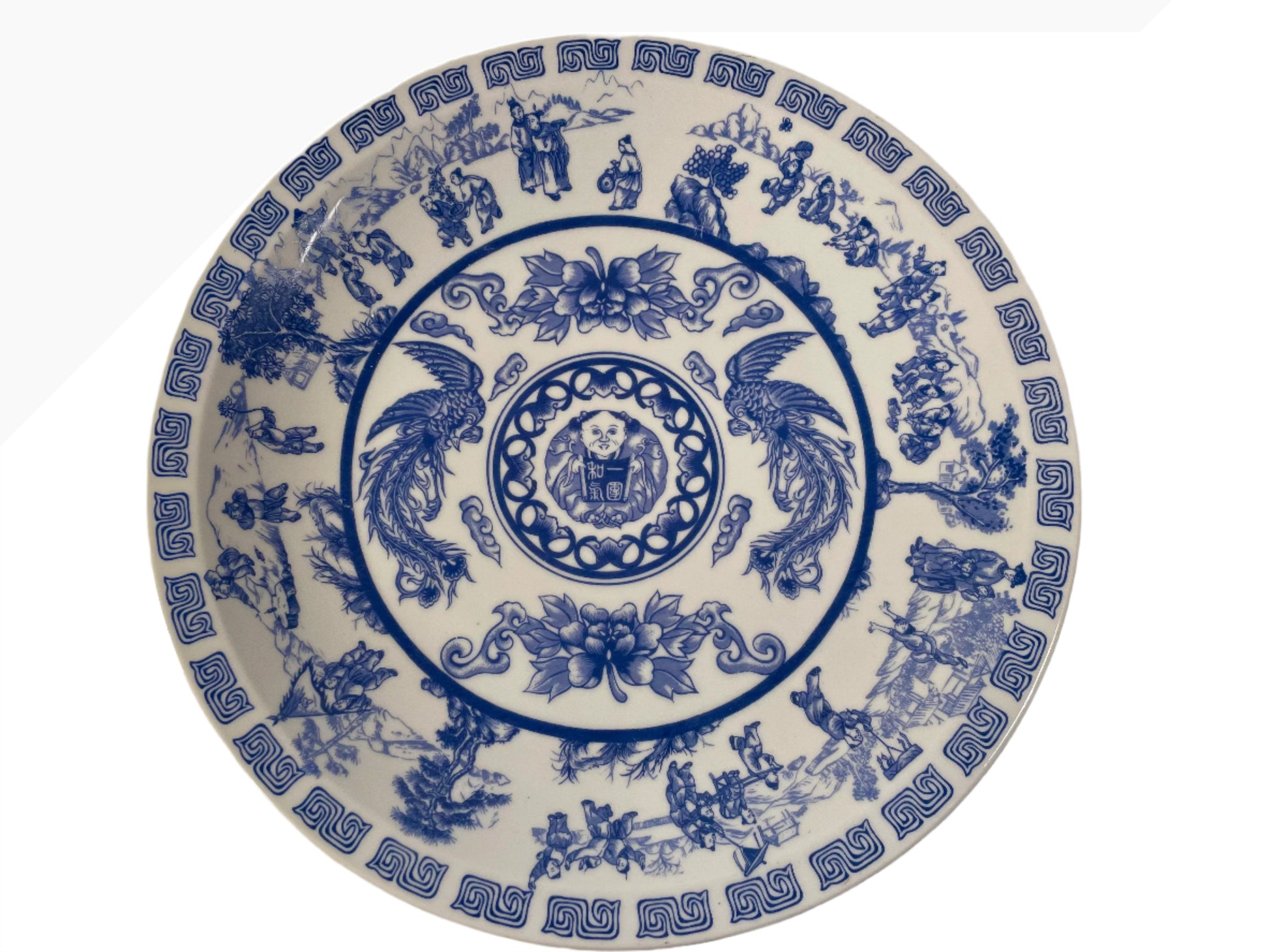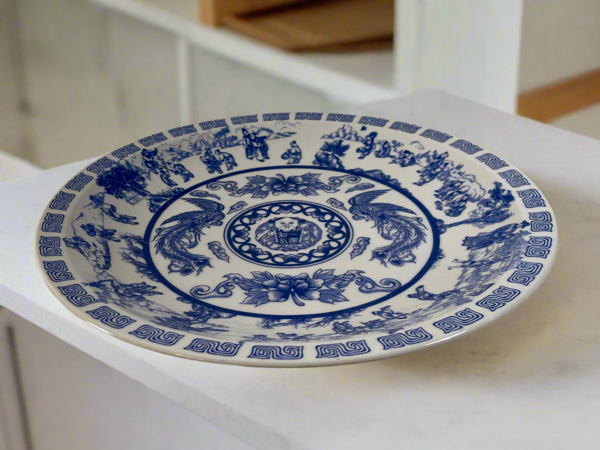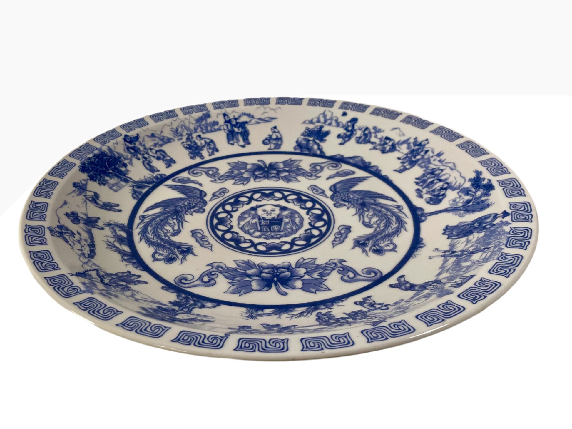 This Chinoiserie styled plate features the classic blue and white design, characteristic of traditional Asian porcelain. Its wide shallow shape makes it suitable for serving or display. The intricate patterns include detailed depictions of figures engaging in various activities, alongside floral motifs and ornamental borders.