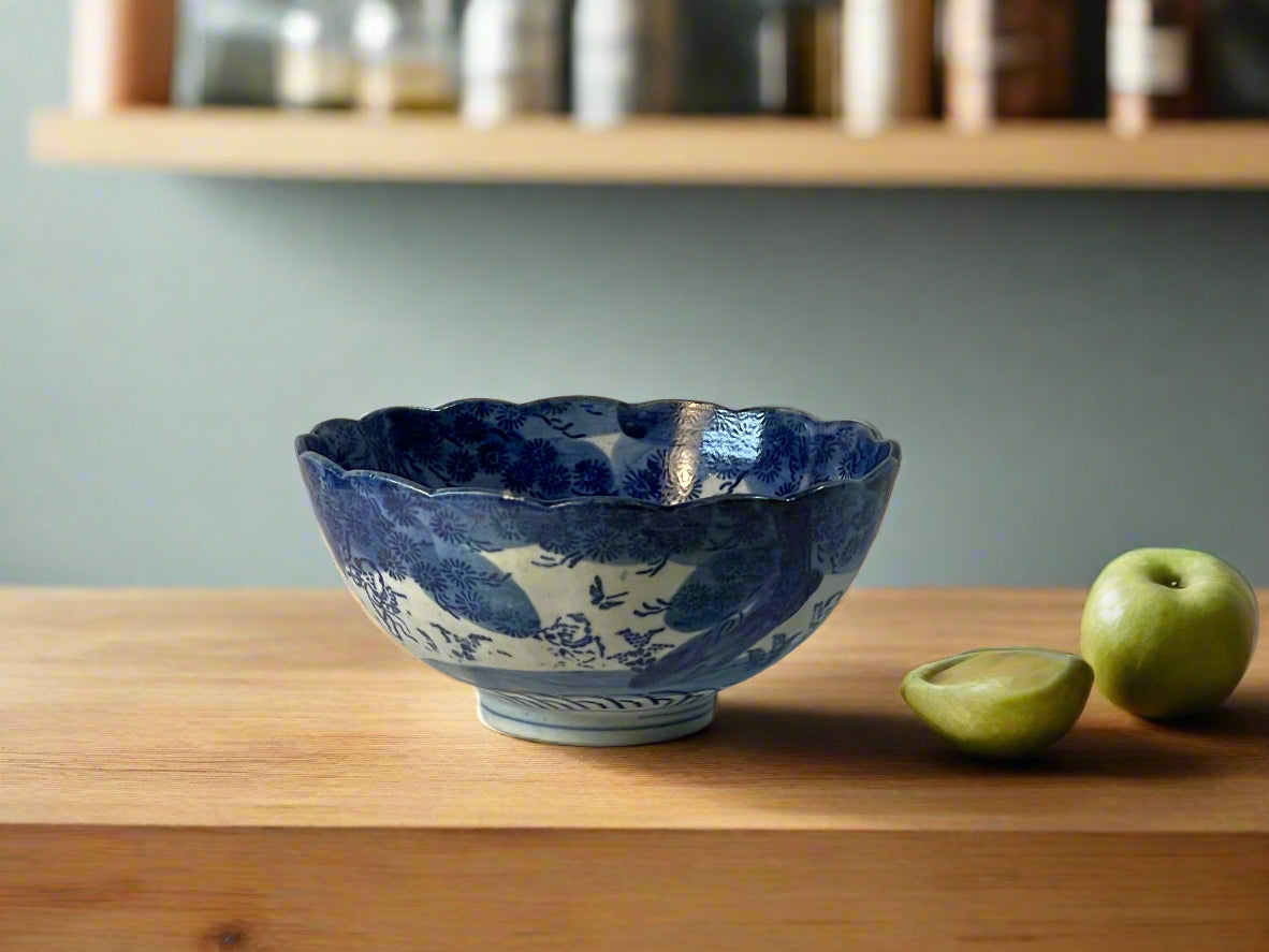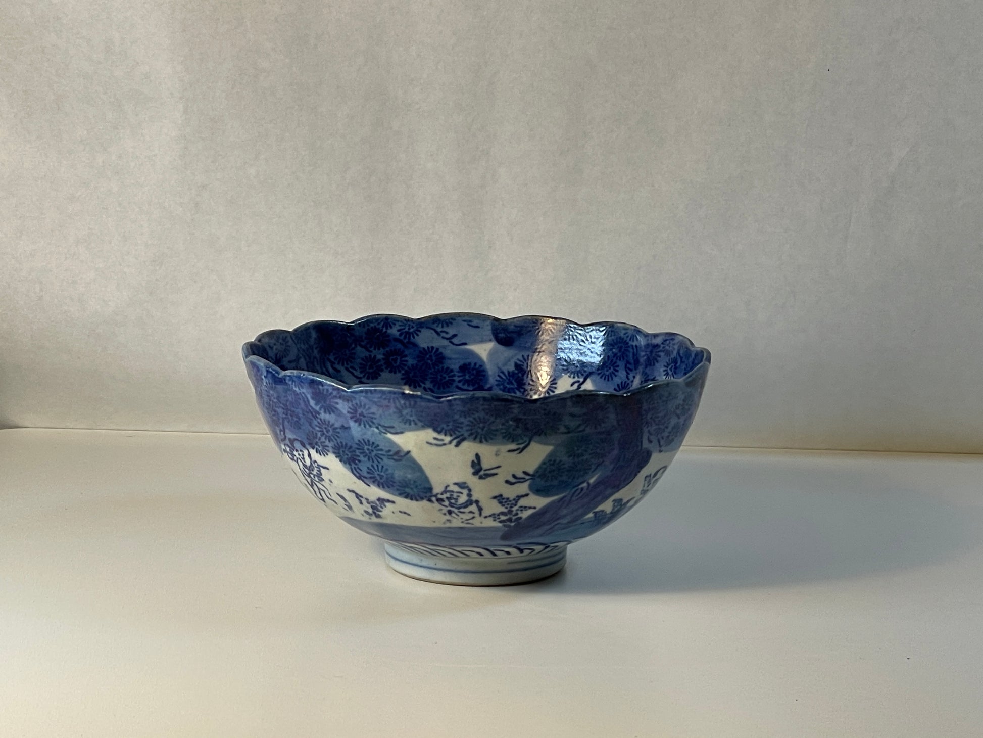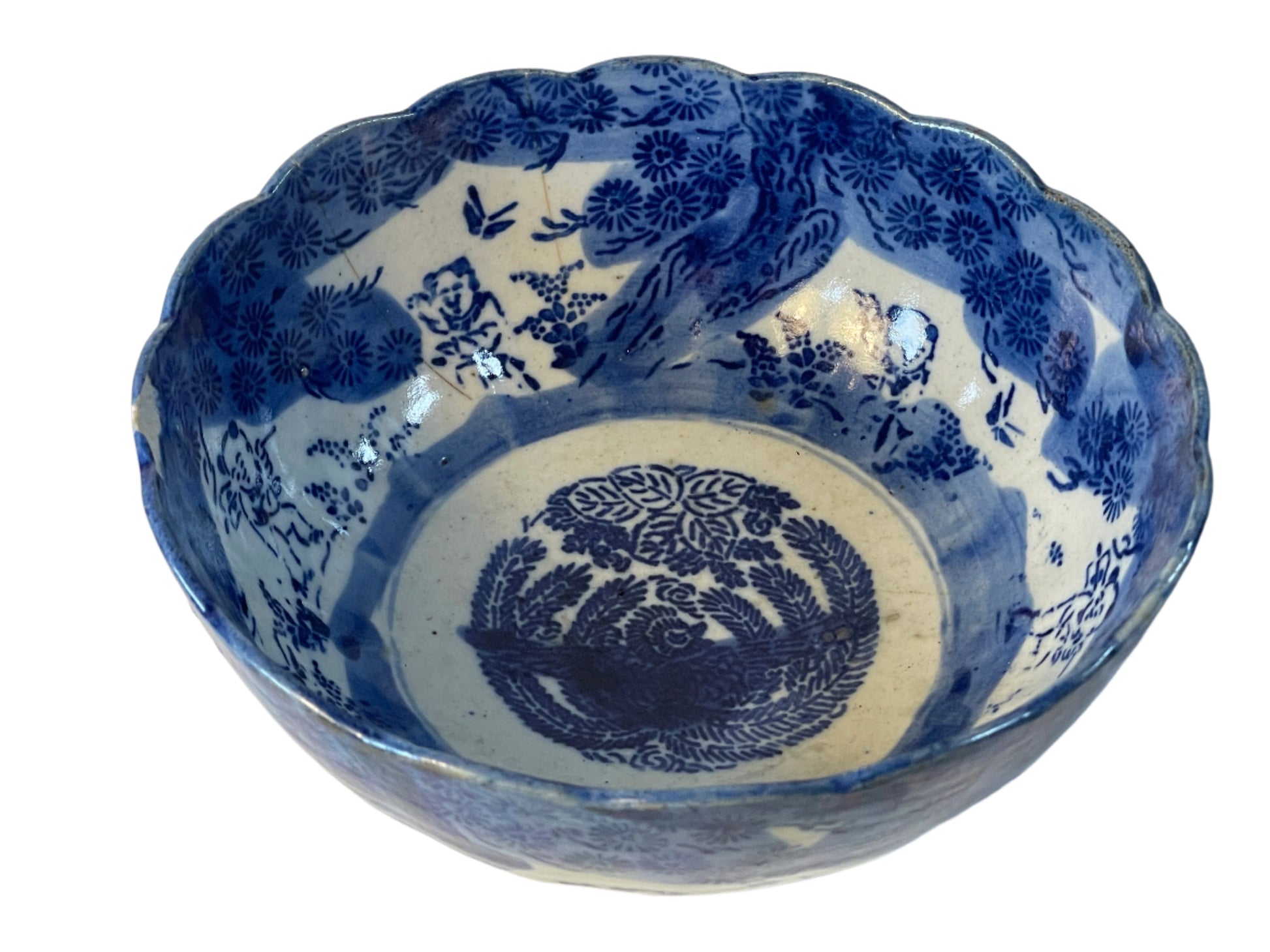 Expertly crafted during the Meiji period in Japan, this medium-sized porcelain bowl features a stunning blue 'Seto' pattern on both the interior and exterior. Adorned with charming scenes of children playing and a stylized Phoenix bird, it is a must-have for any collector. Please note chips at rim in pic #4.