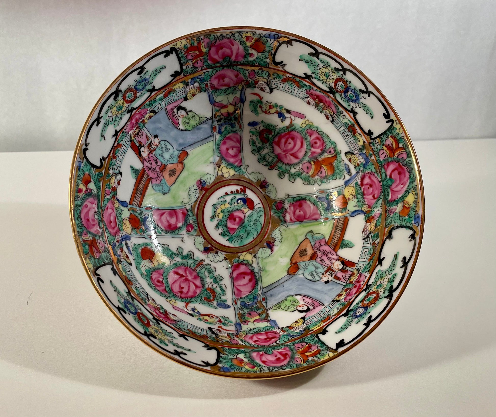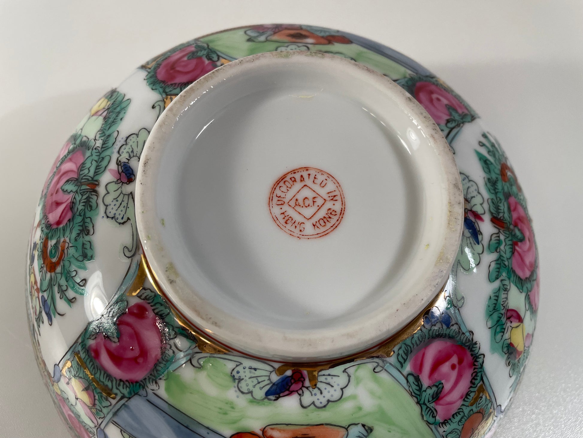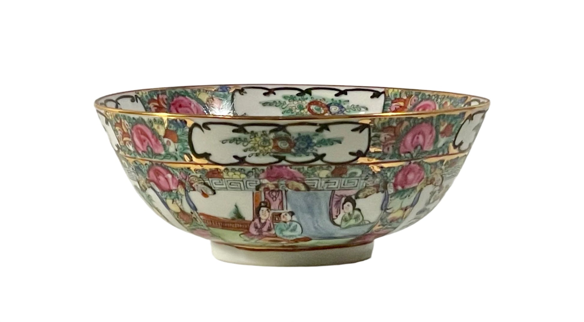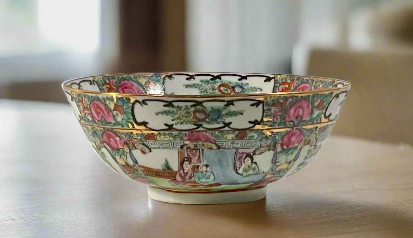 **SOLD**This gold lipped 8” rounded bowl features the vibrant and intricate design typical of Imari porcelain. Its shallow, wide shape is adorned with a rich palette of colors, including deep pinks, blues, greens, and golds. The interior is decorated with detailed scenes, depicting figures in repose surrounded by floral patterns and geometric borders.