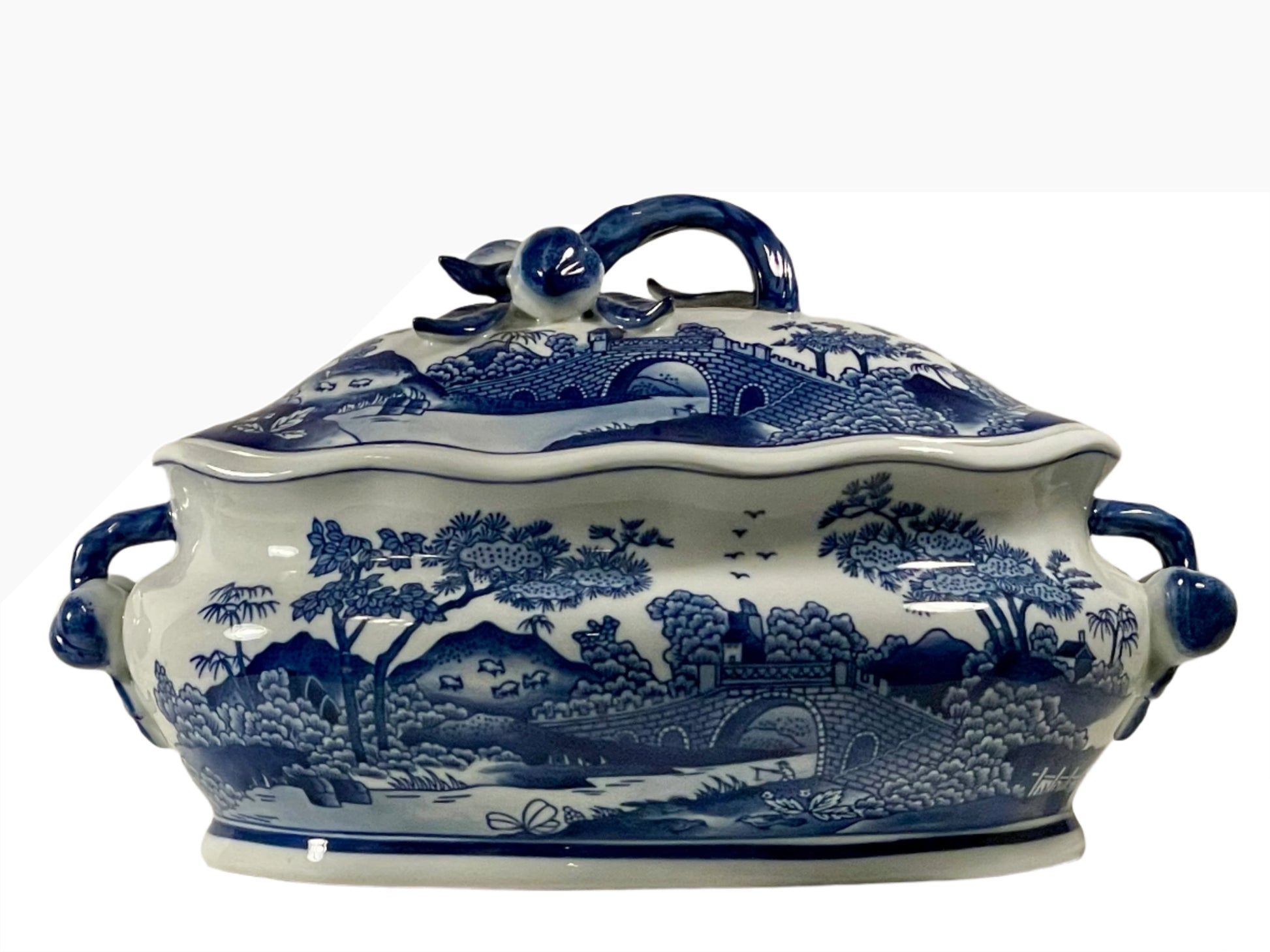This beautiful Bombay chinoiserie tureen replicates the classic blue and white design typical of Chinese porcelain, particularly from the Ming and Qing dynasties.