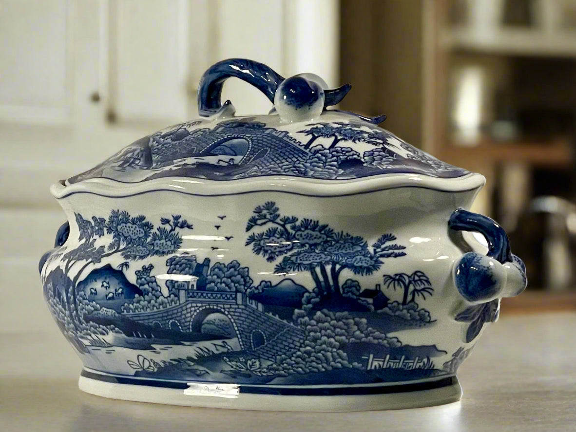Historically, this style originated in China, with blue and white porcelain becoming highly sought after from the 14th century onward. The cobalt blue pigment used for the designs was originally imported from Persia, contributing to the unique aesthetic. The pattern includes scenic landscapes with elements that typically convey a sense of harmony with nature.