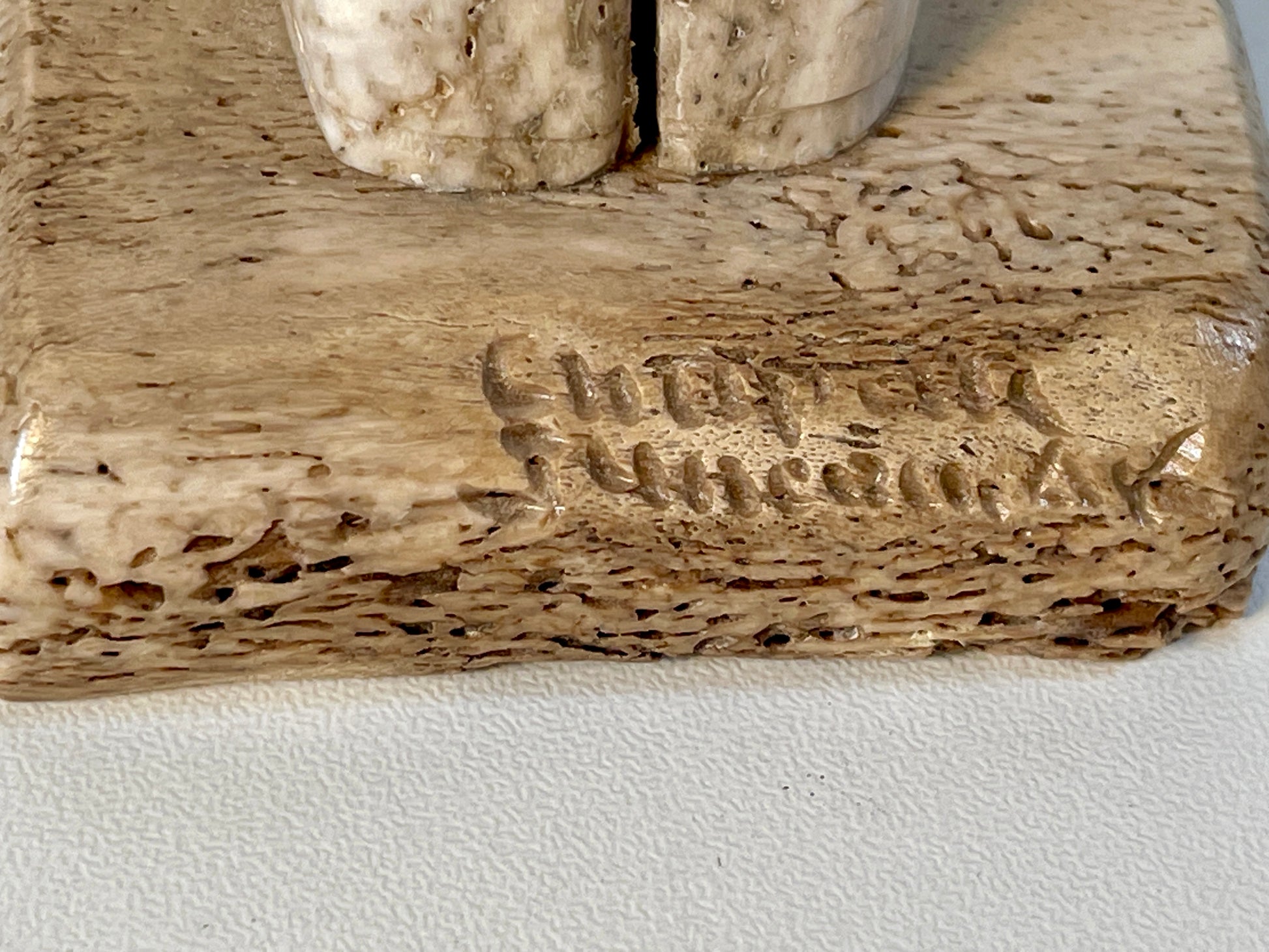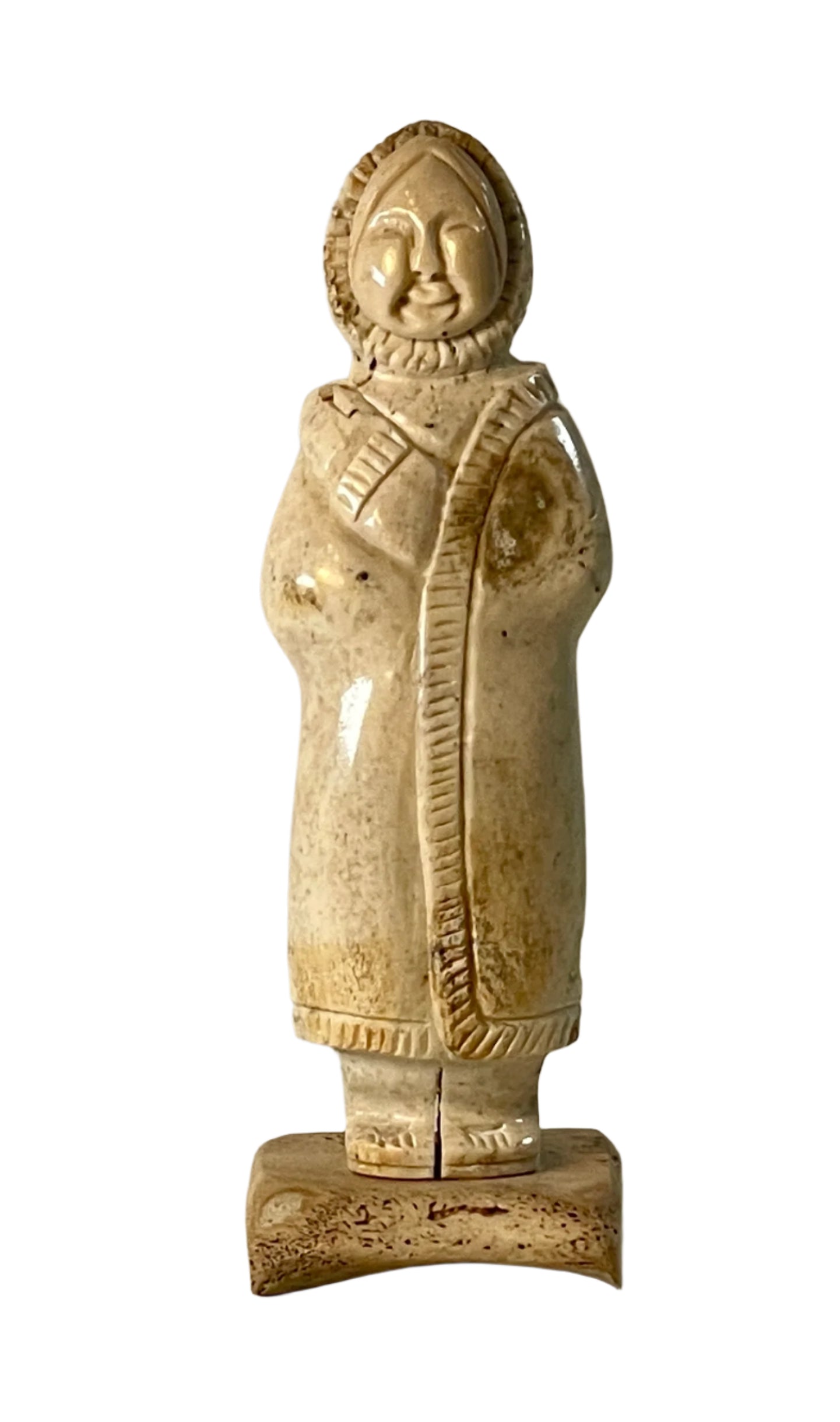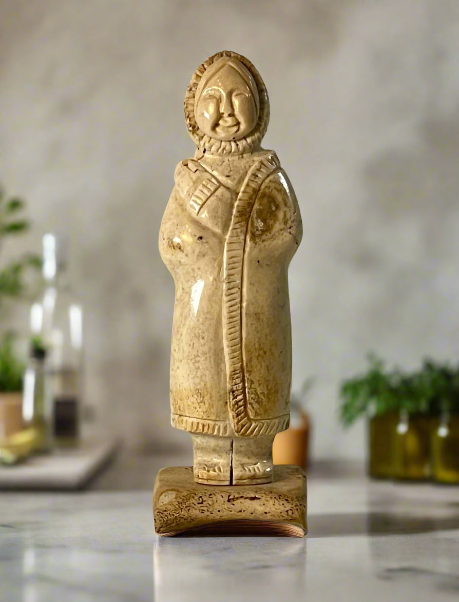 This hand-carved stone sculpture depicts a traditional Inuit woman wearing an Amauti, a parka with a pouch for carrying a child. A symbol of motherhood, this piece represents the important cultural heritage of the Inuit people. Made in Canada, it is a beautiful and meaningful addition to any collection.