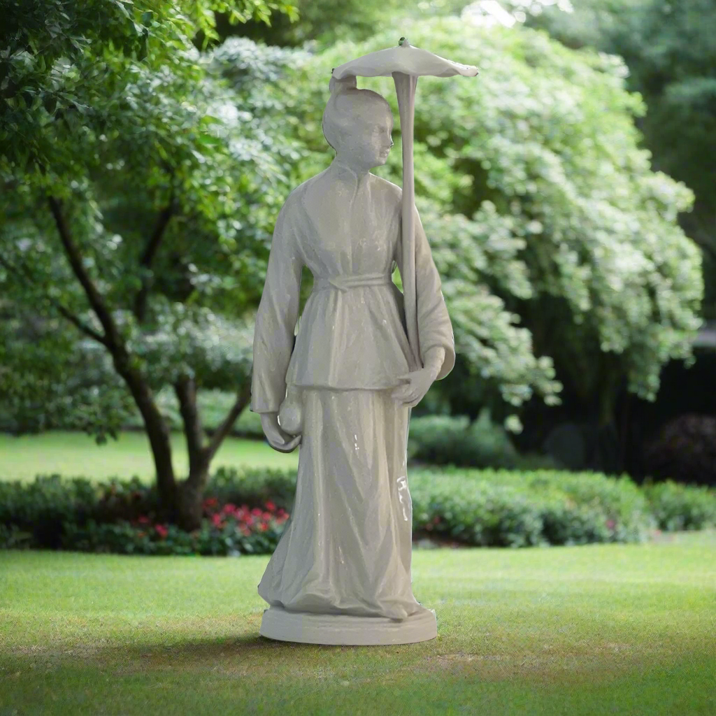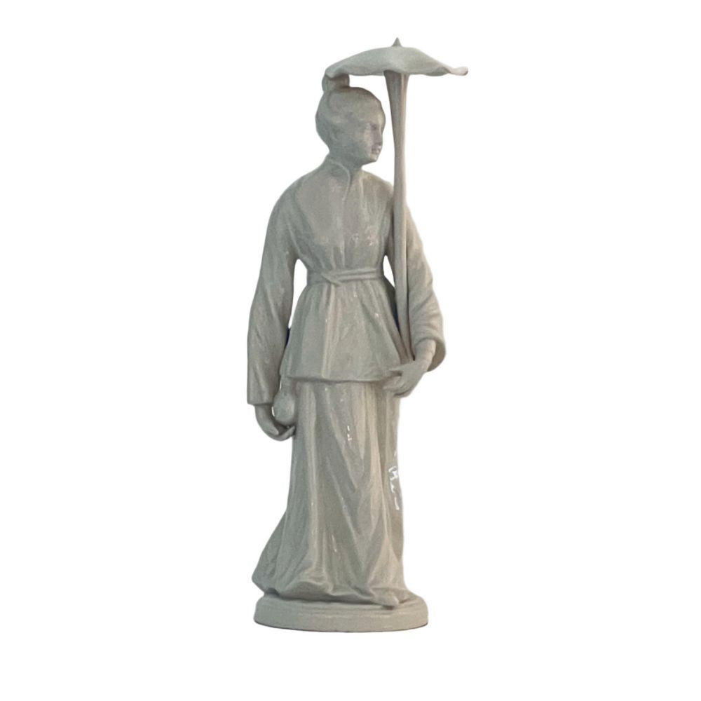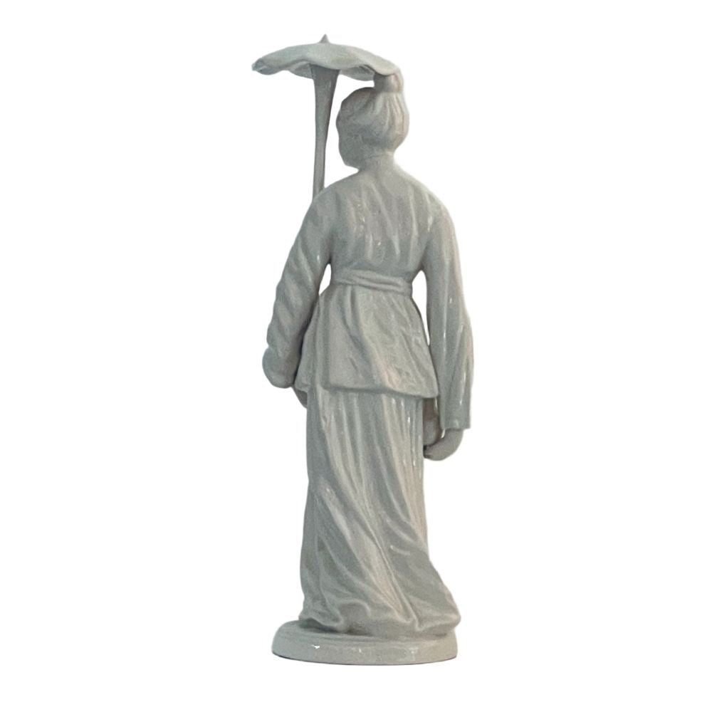 This is an Ethan Allen Asian porcelain figurine made in Italy of a woman holding an umbrella. The style and attire suggest a traditional or historical influence, possibly inspired by Asian art.