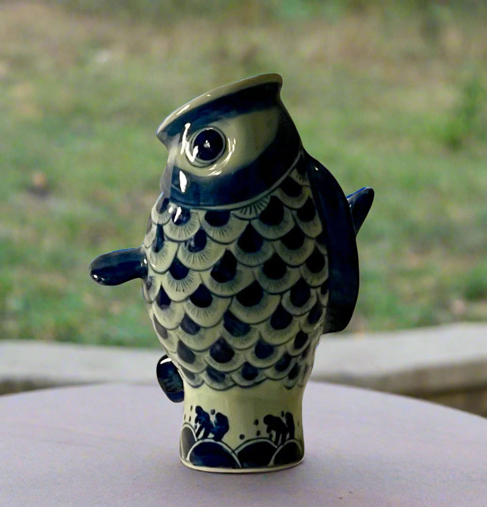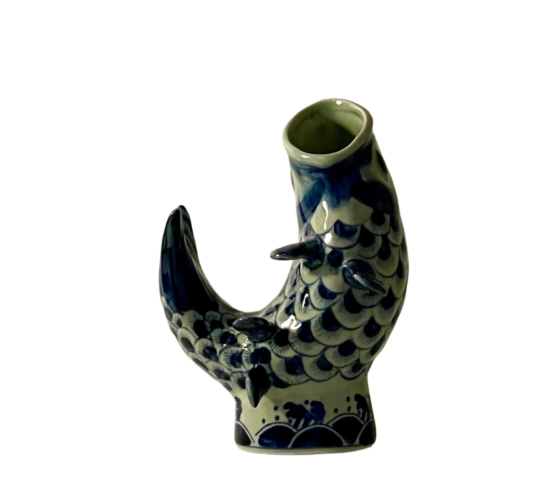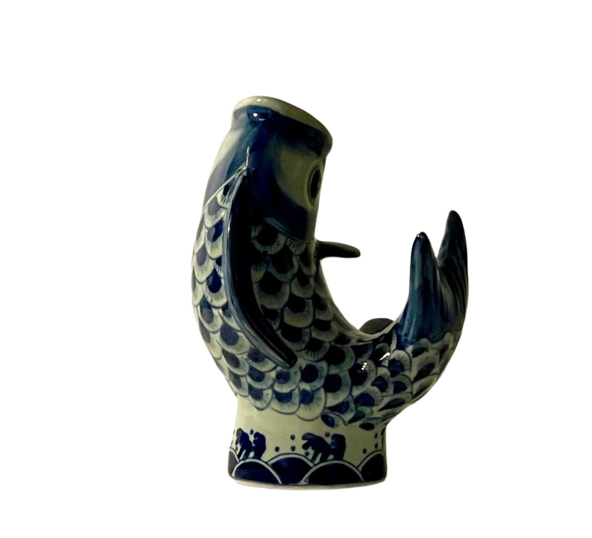 The hand-painted cobalt blue detailing highlights the intricate scales, fins, and expressive eyes of the fish, creating a sense of movement and depth. The open mouth serves as the vase’s opening, making it both a functional and decorative piece. The gracefully curved body and tail add to its dynamic form, making it eye-catching for any collection.
