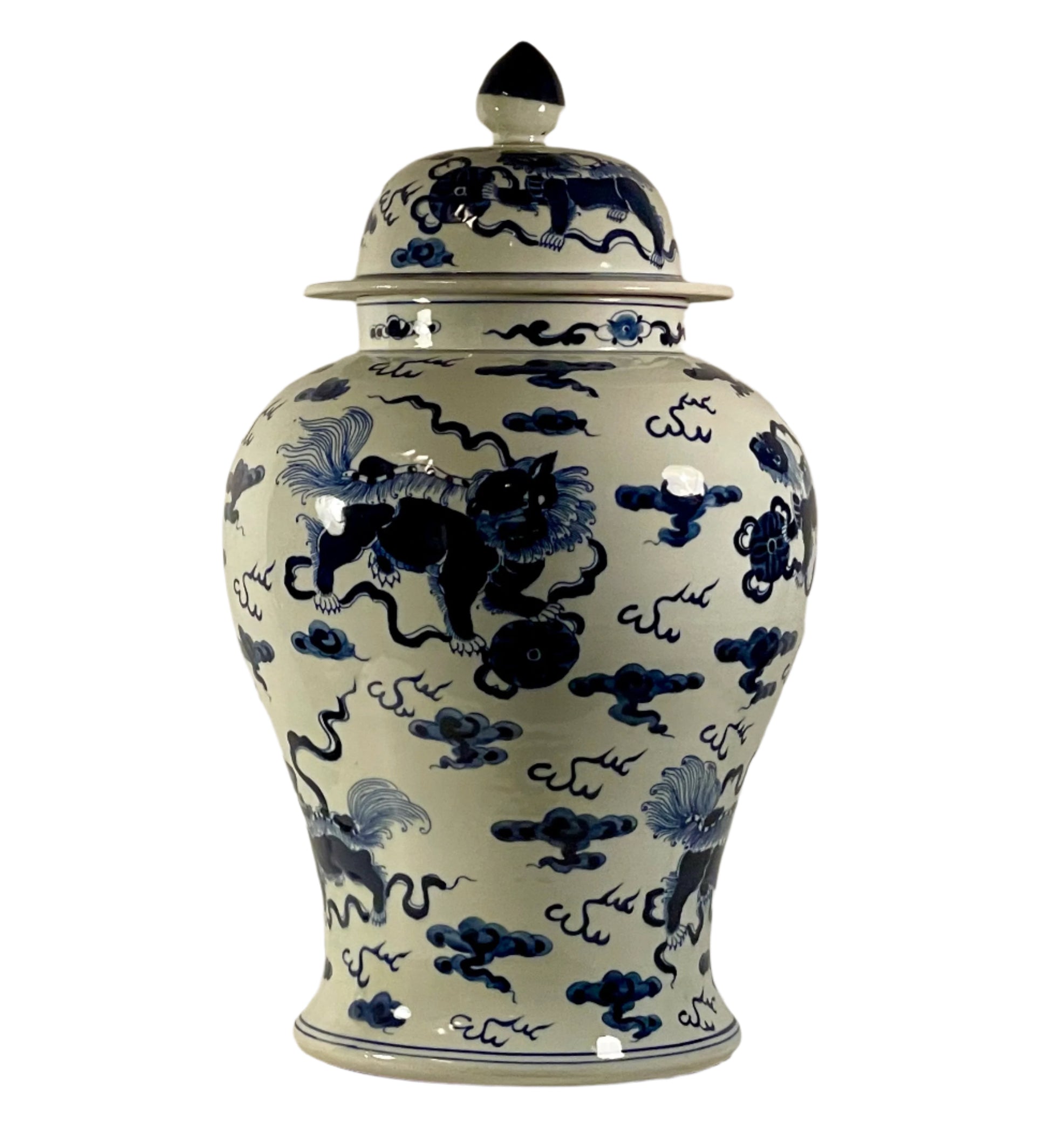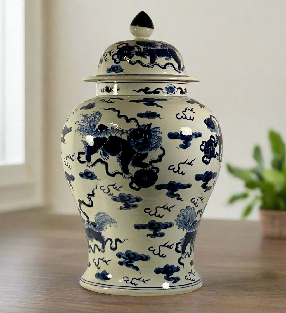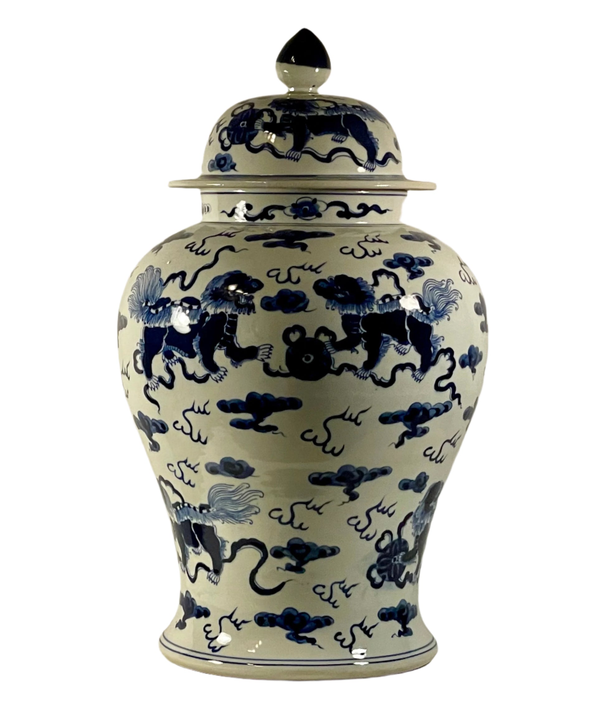 This oversized ginger jar is a traditional piece of porcelain, characterized by its distinctive shape and intricate design. It features a rounded body that tapers slightly towards the base, topped with a matching lid that has a finial. The jar is adorned with a classic blue and white pattern, showcasing detailed motifs, including dragons, foo dogs and other mythical creatures, surrounded by swirling clouds. The blue designs contrast beautifully against the white background, giving it a vibrant, impactful eye-catching appearance. This piece will serve as a decorative item, embodying both elegance and cultural significance.