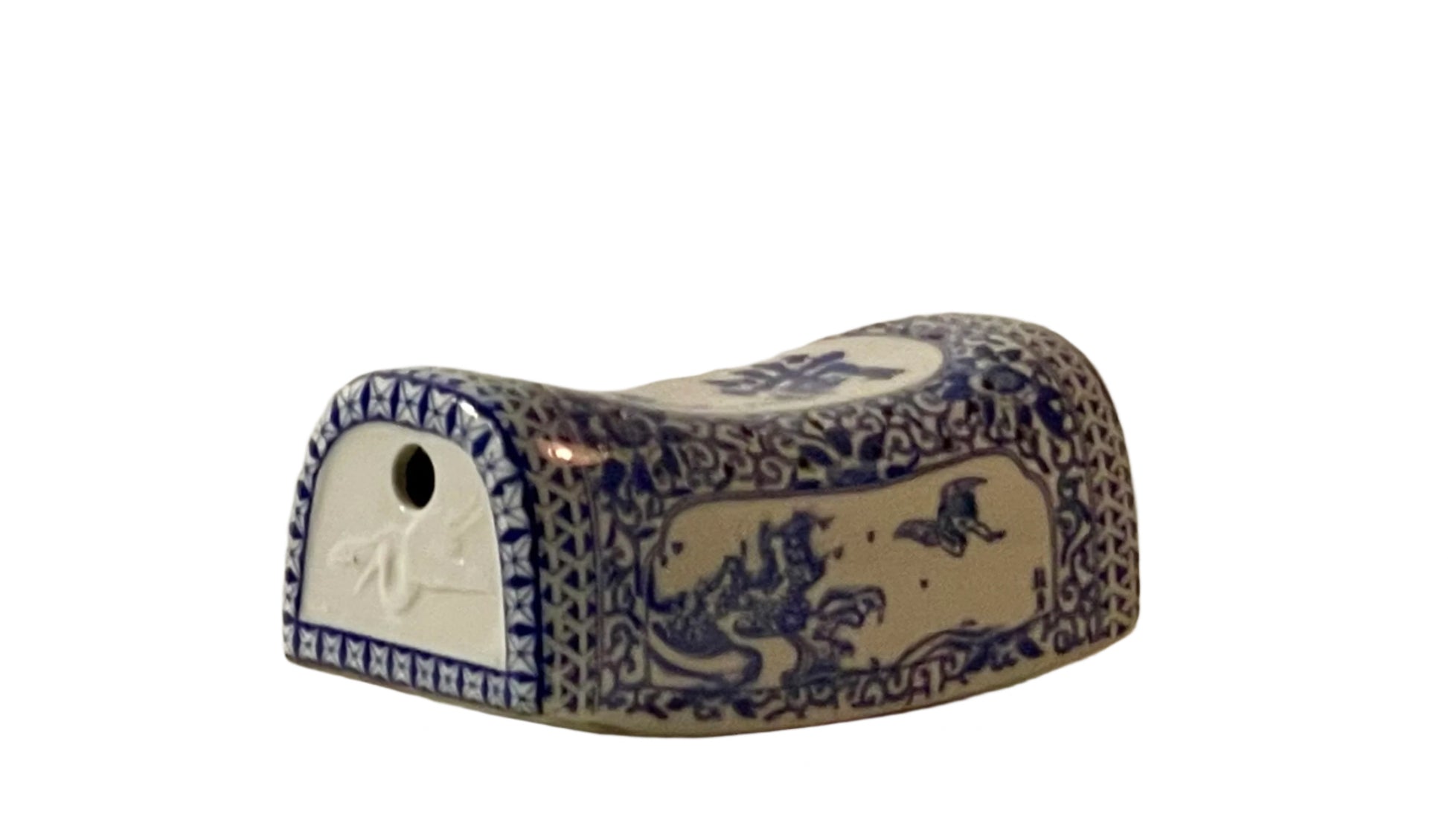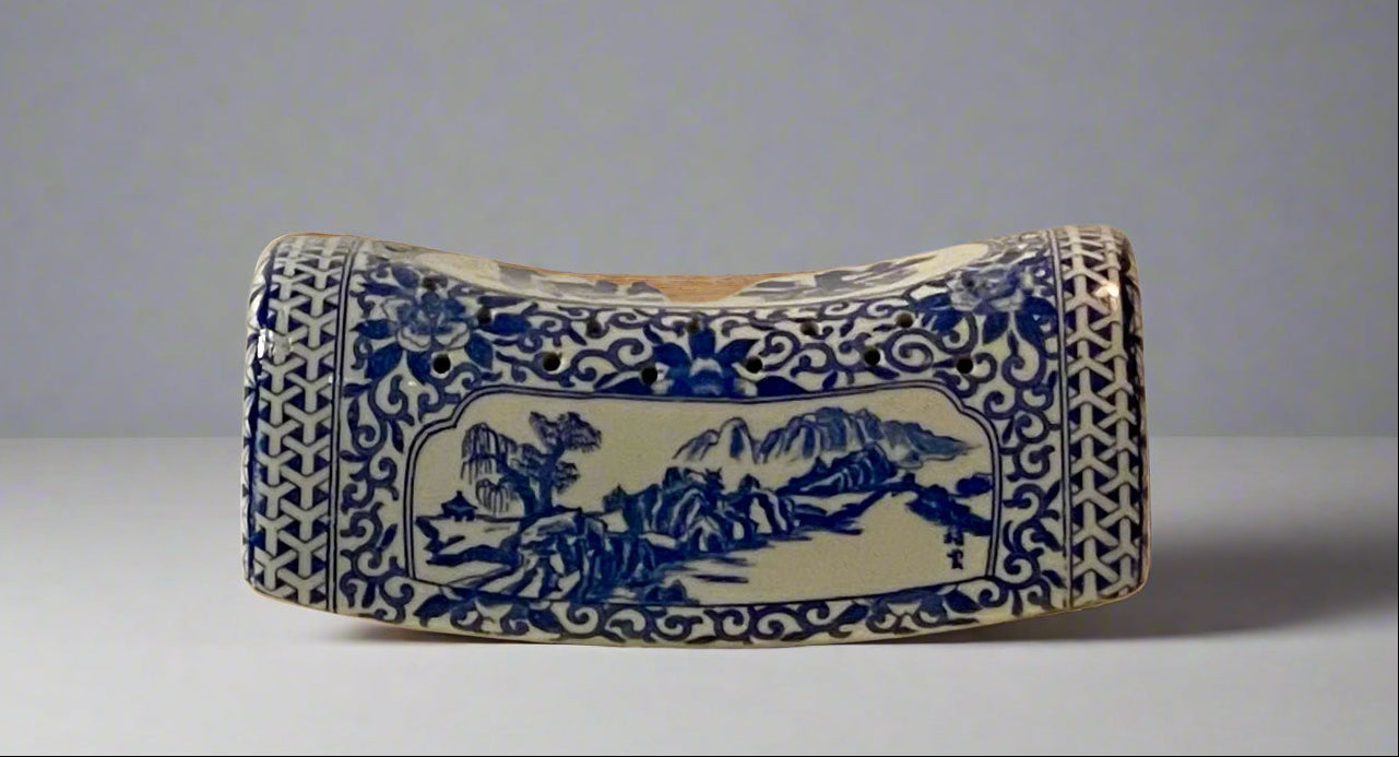 This traditional vintage Asian opium pillow is distinguished by its cylindrical shape and decorative design. It is made of porcelain and features intricate blue and white patterns, which are characteristic of Chinese ceramics. The surface is adorned with Chinese characters, likely conveying a message of comfort & happiness, along with floral & scenic motifs that enhance its aesthetic appeal.