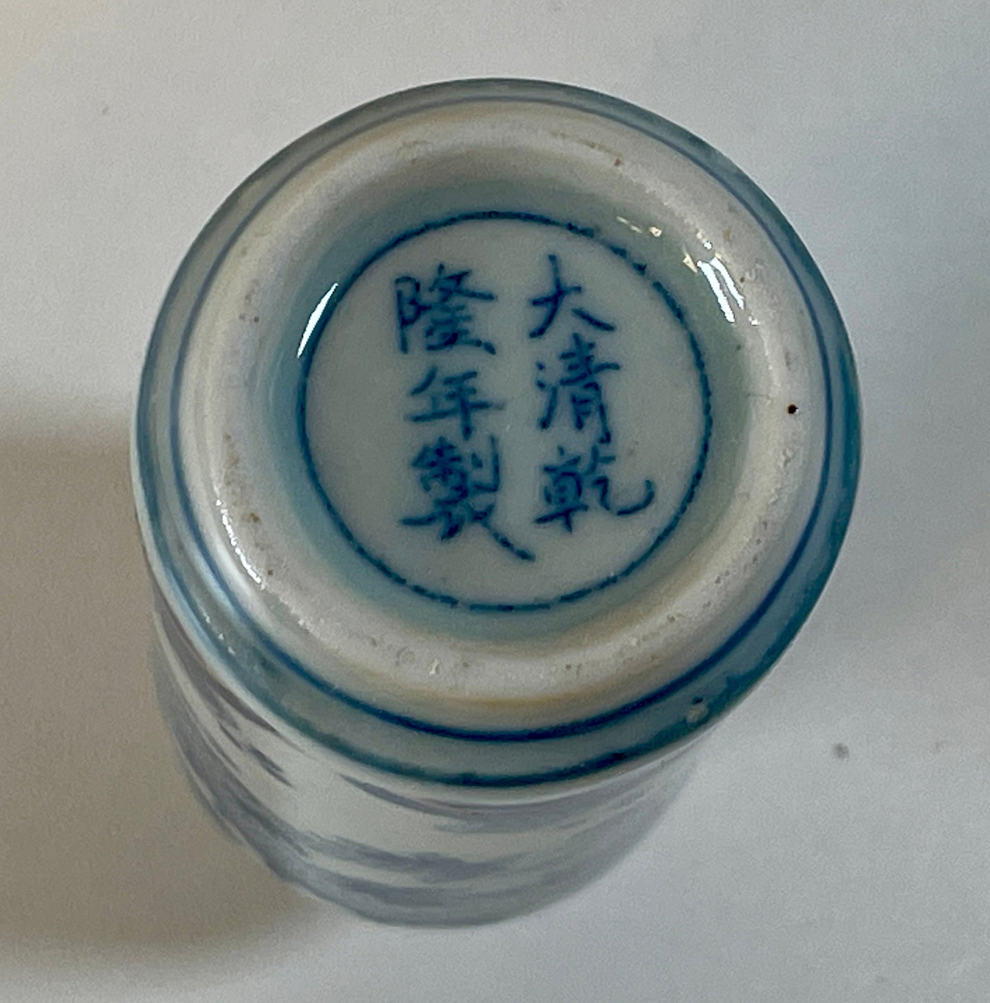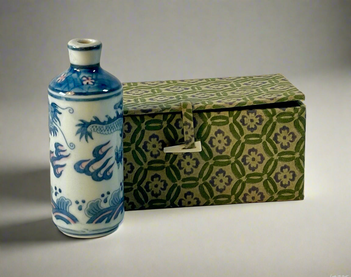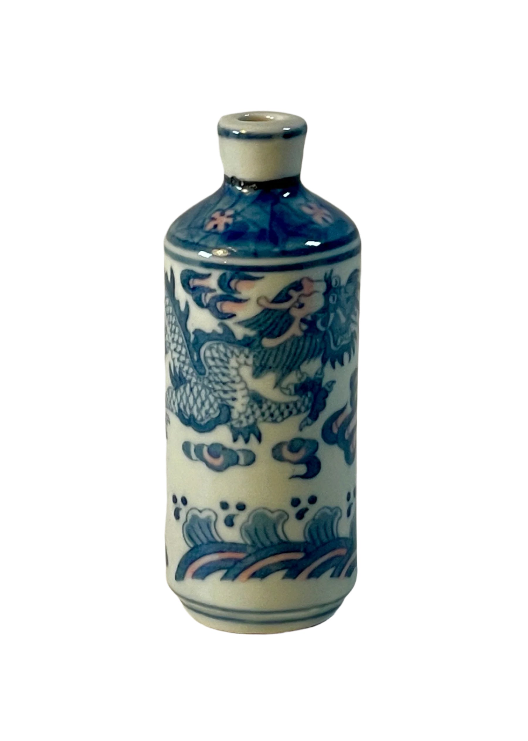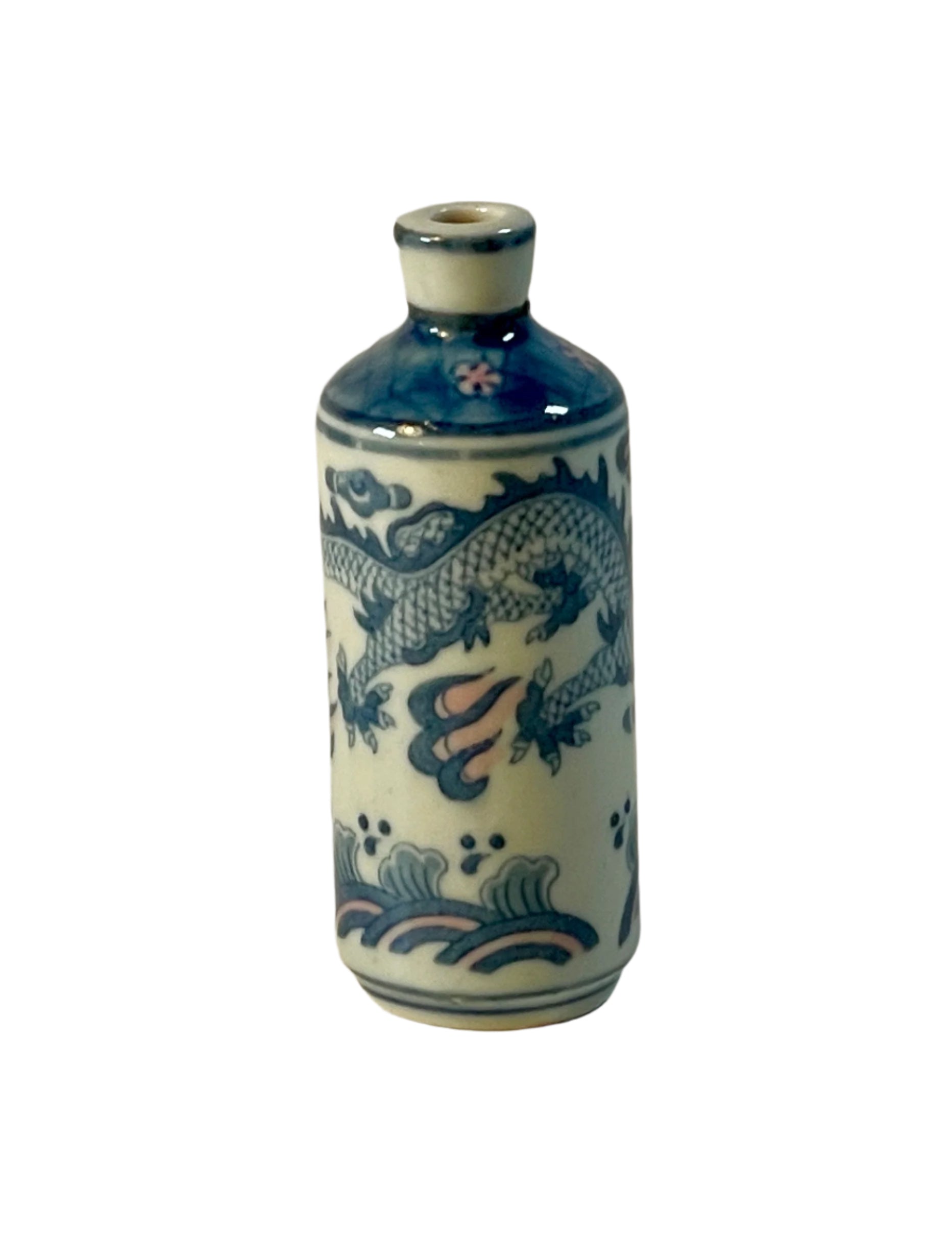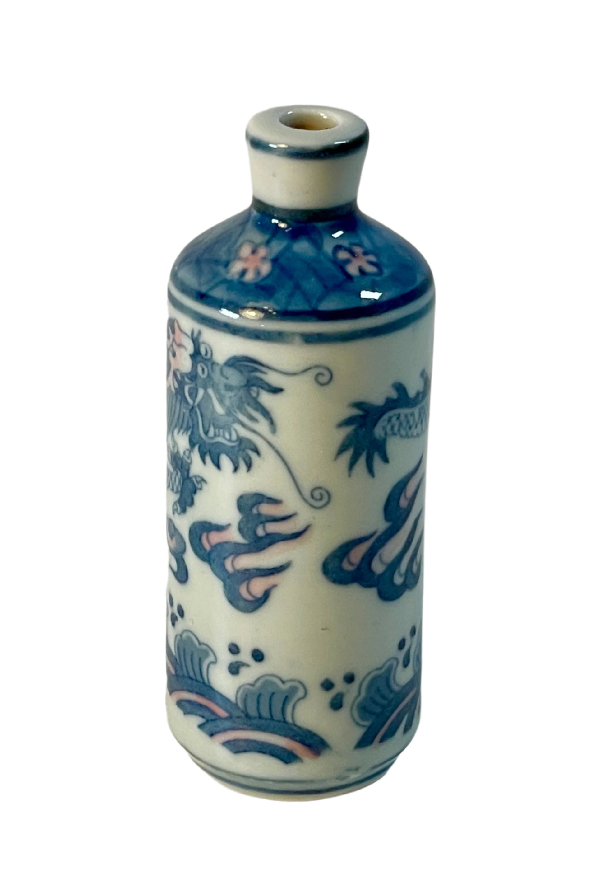 Examine this exquisite Chinese 18th century inspired snuff bottle, made of fine porcelain. Its delicate design and intricate details of a five clawed dragon amongst the clouds are a testament to the skilled craftsmanship of that era. Perfect for collectors and connoisseurs of beautifully crafted Chinese artifacts. Please see the blue six-character reign mark underfoot.