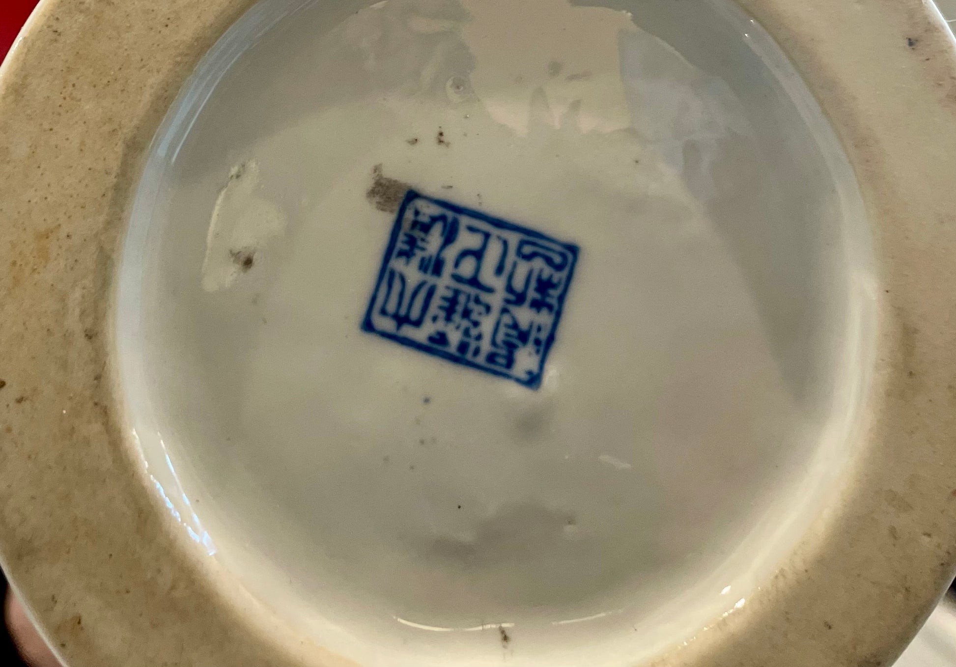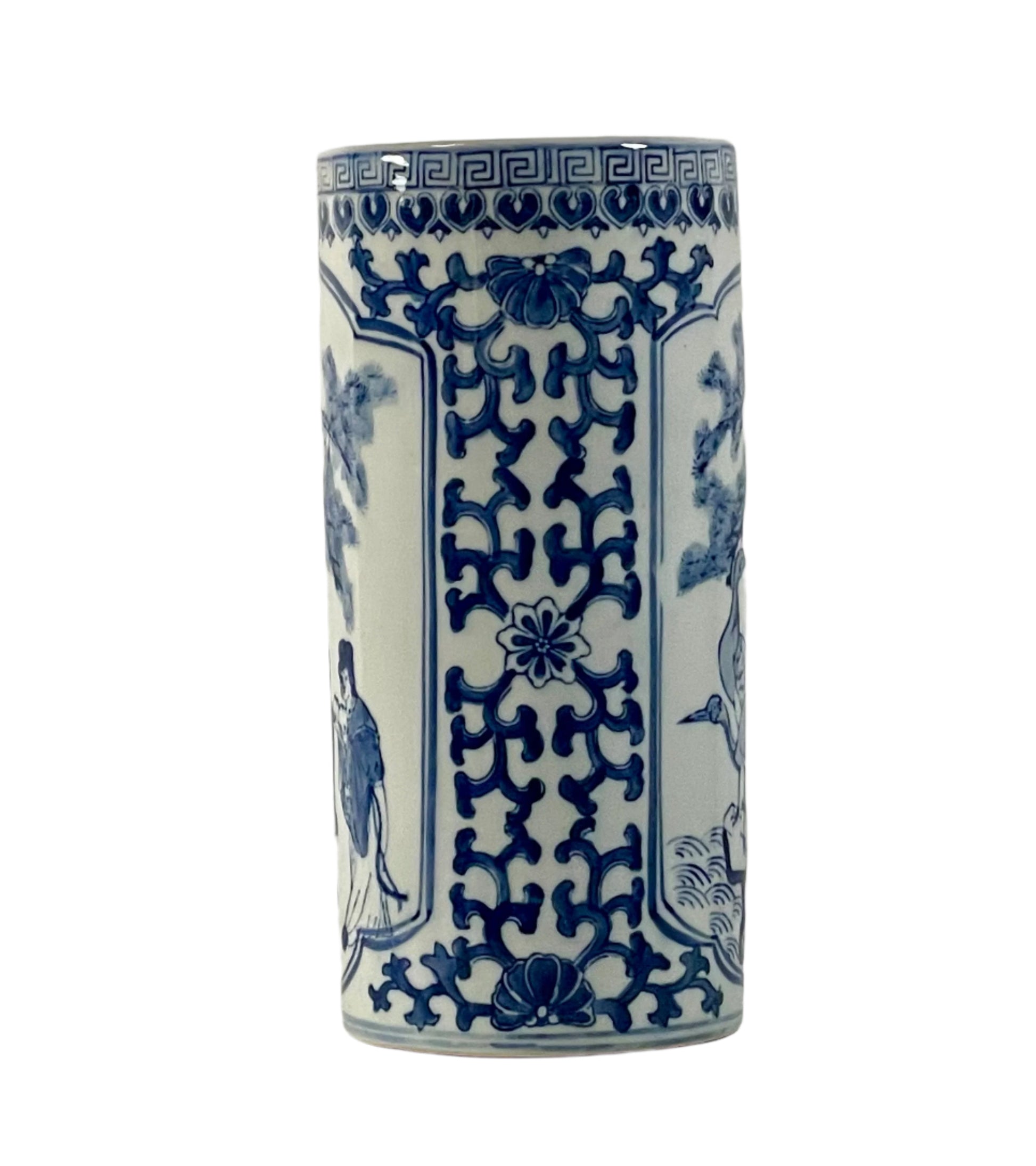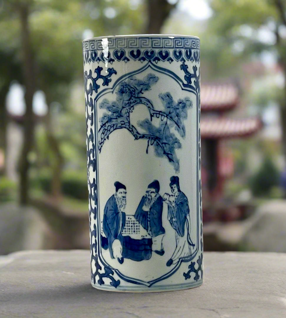 This cylindrical shaped vase features detailed illustrations of figures and trees, characteristic of classic Chinese art. It has a decorative border at the top, and the overall aesthetic is elegant and intricate. Would nicely hold a floral arrangement or perhaps a collection of calligraphy & art brushes. See photo #4 for marking.
