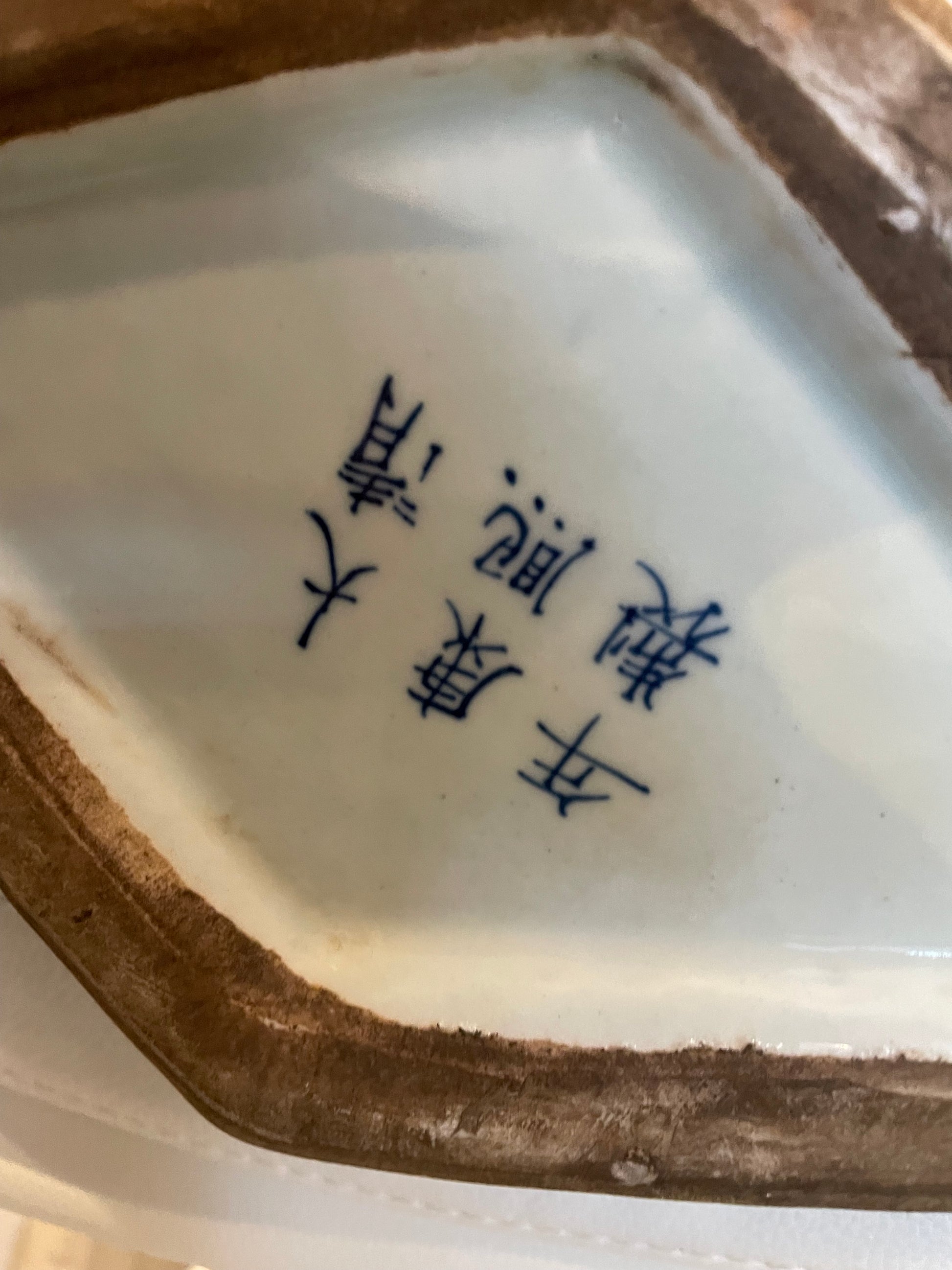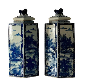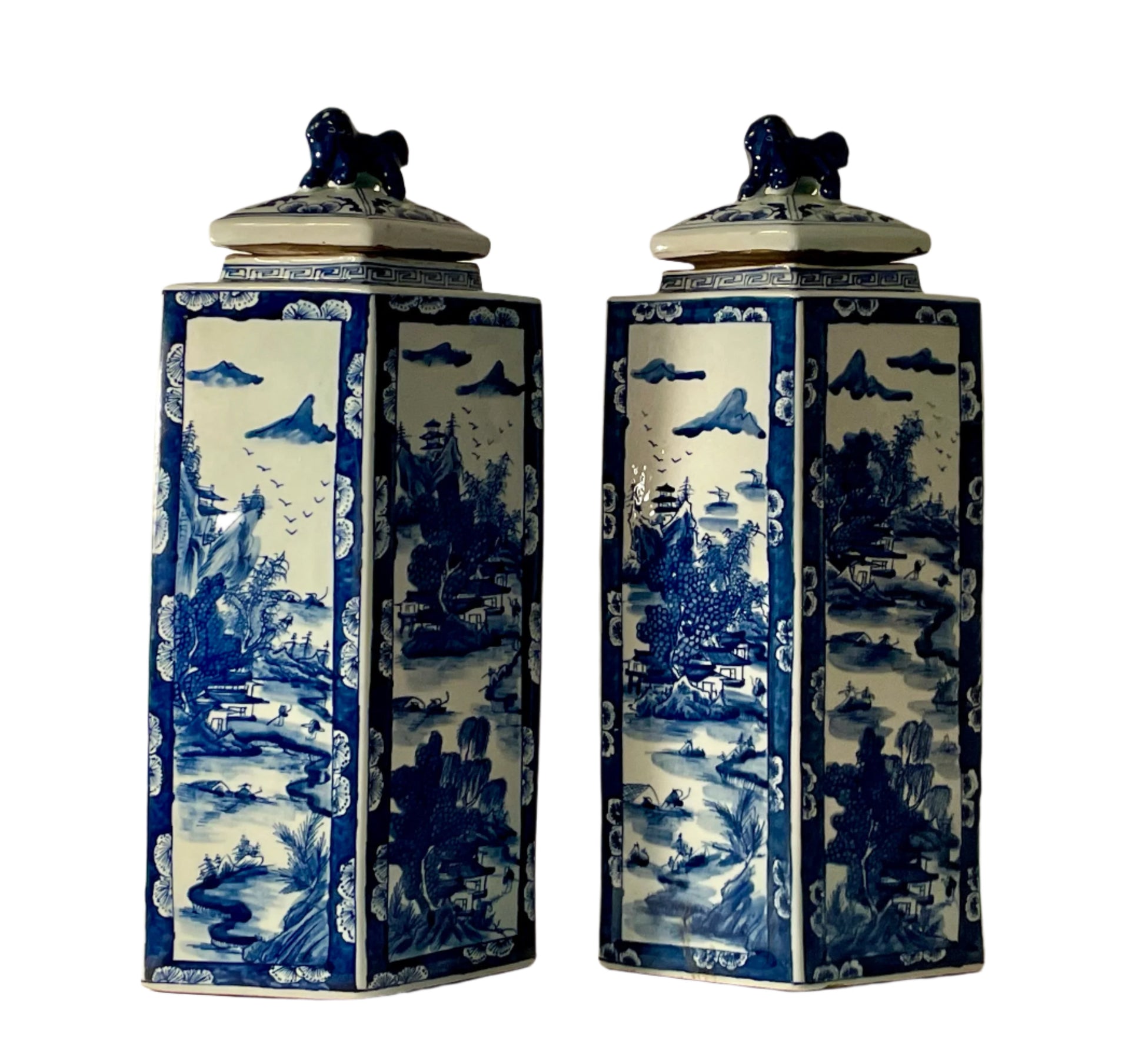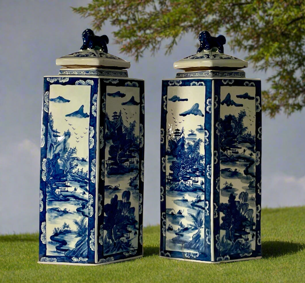 This pair of chinoiserie vases feature a tall rectangular shape with lids topped with foo dogs, a traditional symbol of protection and good fortune. The body of the vases showcase a striking blue and white color scheme, with scenic landscapes and decorative motifs typical of chinoiserie style. See photo #4 for markings.