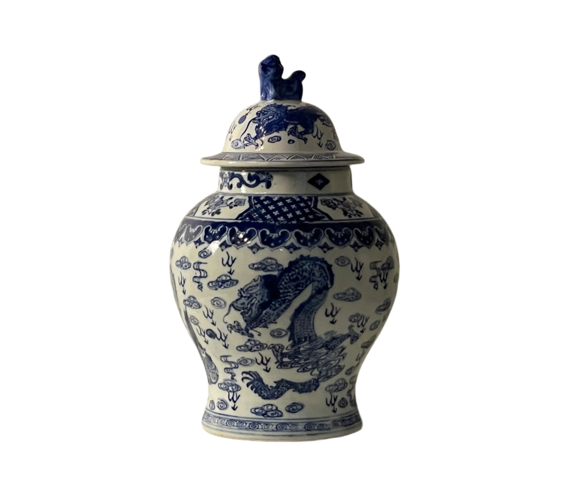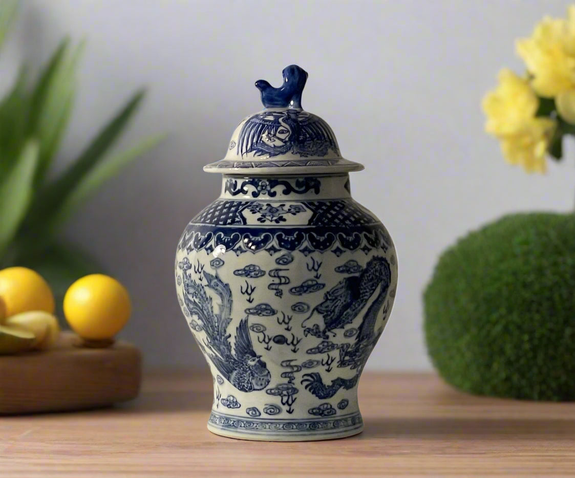 This vintage blue and white porcelain ginger jar features an intricate dragon motif, symbolizing power and protection in traditional Chinese art. The detailed cobalt blue design contrasts beautifully against the white background, showcasing swirling clouds and a fierce dragon in motion. The jar’s rounded body and slightly flared base give it a balanced and elegant shape. Topping the piece is a matching lid adorned with a sculpted foo dog finial, adding a regal and symbolic touch. A striking decorative piece, this jar blends classic artistry with timeless appeal, making it an excellent addition to any collection.